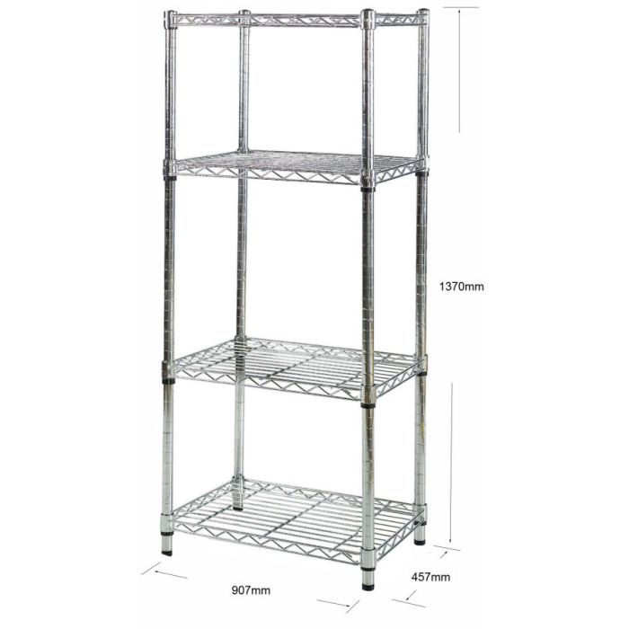 High quality 1370 x 907 x 457mm durable chrome wire shelving ready for next day delivery. 1370mm high supplied with four shelves. Delivered flat packed, our chrome shelving units only take a couple of minutes to put up or take down. Easy assembly without tools, nuts and bolts.