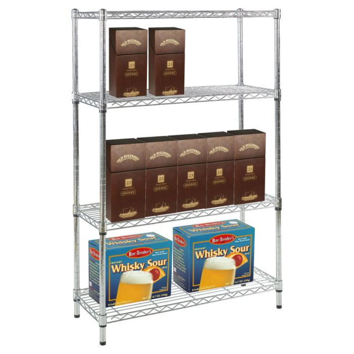 High quality 1625 x 907 x 457mm durable chrome wire freestanding shelving ready for next day delivery. 1625mm high supplied with four shelves. Delivered flat packed, our chrome shelving units only take a couple of minutes to put up or take down. Easy assembly without tools, nuts and bolts.