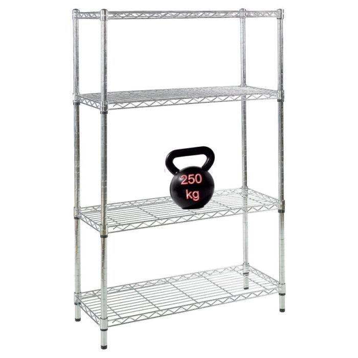 High quality 900 x 1220 x 355mm durable chrome wire shelving ready for next day delivery. 900mm high supplied with four shelves. Delivered flat packed, our chrome shelving units only take a couple of minutes to put up or take down. Easy assembly without tools, nuts and bolts.